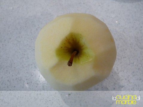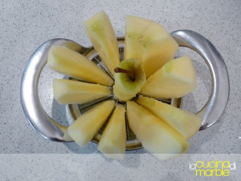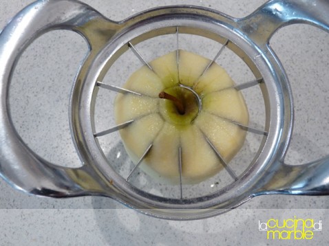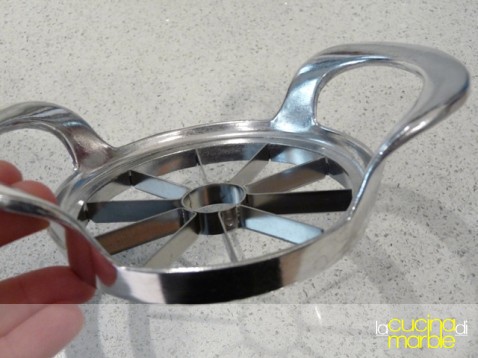 pressando il taglia mela sulla mela, si otterranno tanti spicchi regolari e allo stesso tempo si leverà il torsolo