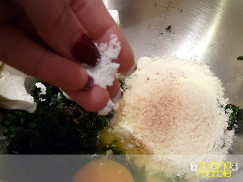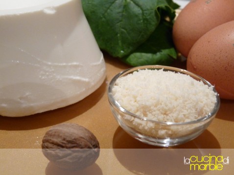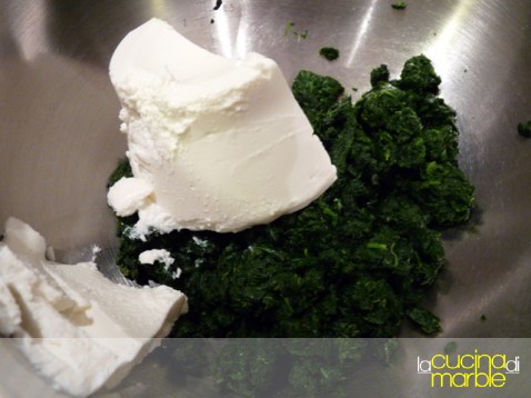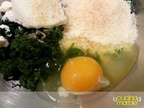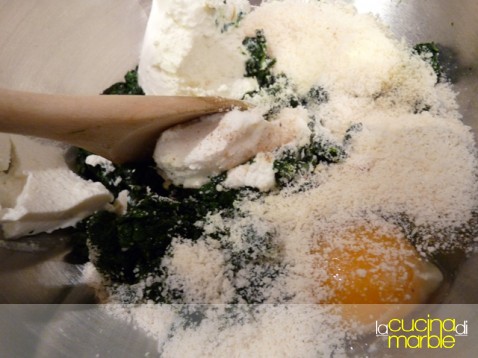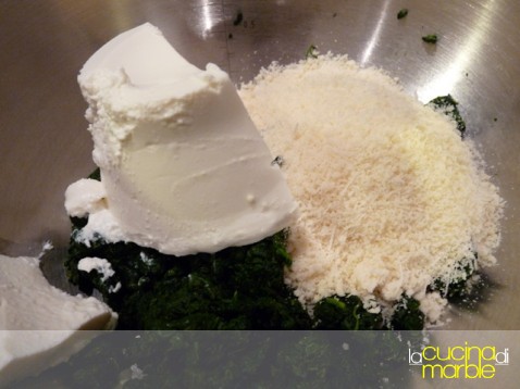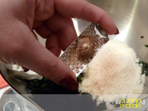 mettiamo il trito di spinaci in una terrina, aggiungiamo la ricotta (se fosse molto umida strizzarla), il parmigiano grattugiato, la noce moscata e le uova (tenendo da parte il tuorlo in più, andrà aggiunto solo se l'impasto fosse troppo sodo)