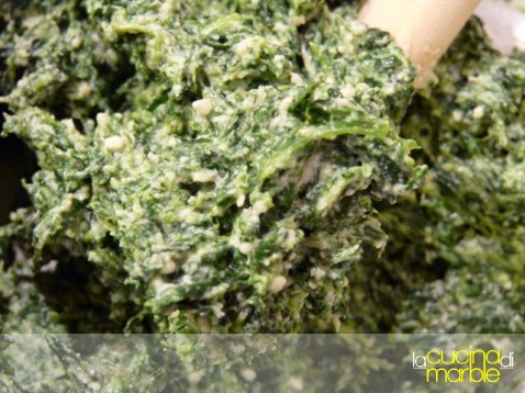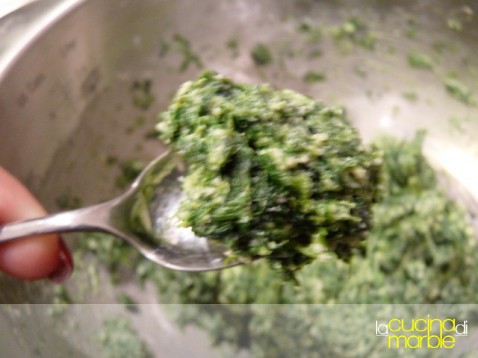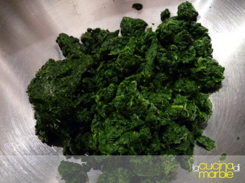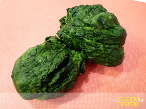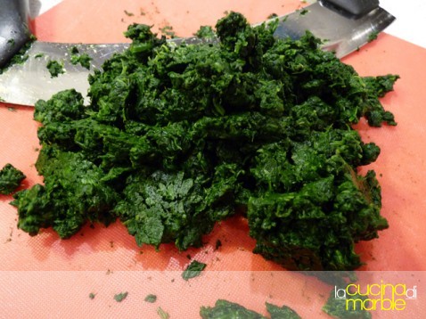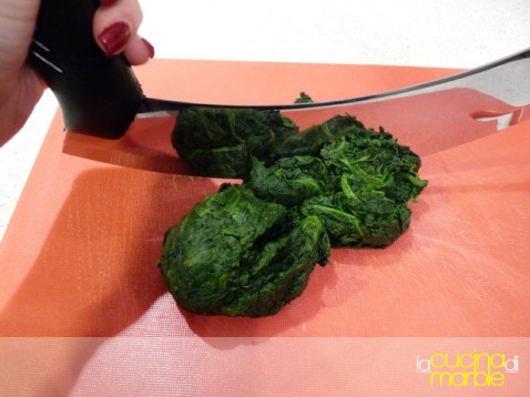 una volta che gli spinaci saranno ben freddi e strizzati, andarli a tritare con la mezzaluna (non dovranno essere troppo fini, l'operazione si può fare anche a coltello)