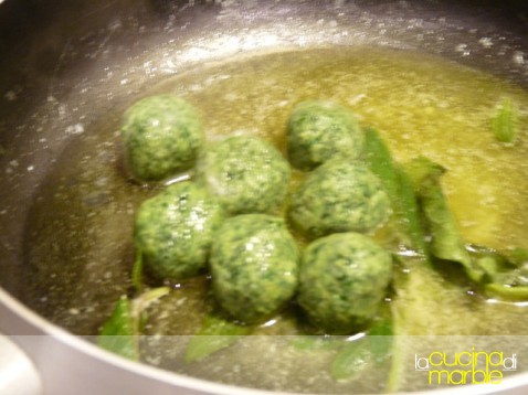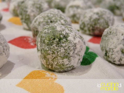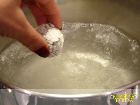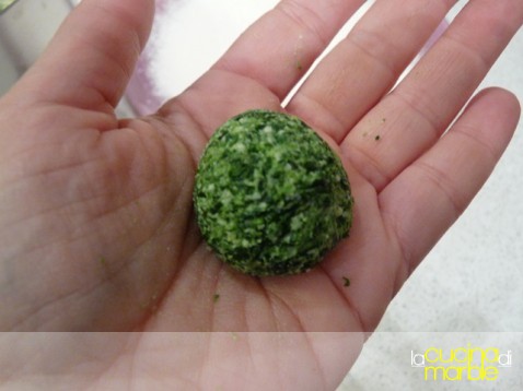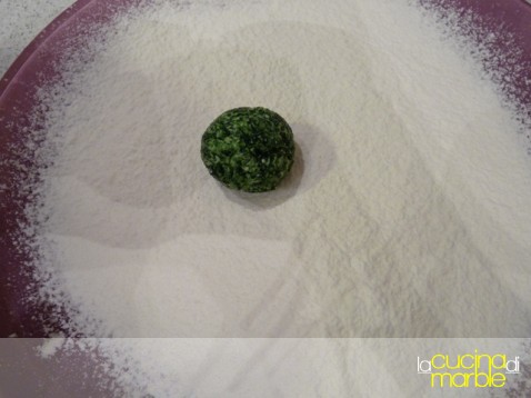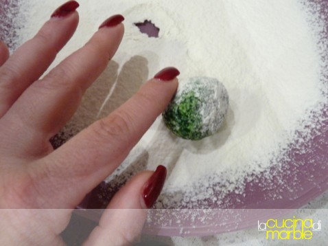 adesso andiamo a preparare gli gnudi, preleviamo una noce di impasto e formiamo una pallina che andremo a ripassare nella farina, questo servirà a formare una specie di pellicola sigillante ad ogni pallina
