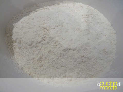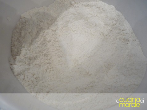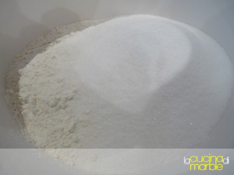 come prima cosa ho messo nel contenitore la farina, lo zucchero ed il lievito e li ho amalgamati