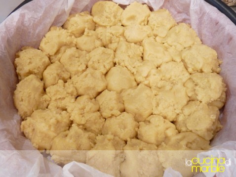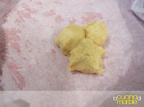 prepararsi una teglia rivestita di cartaforno, prelevare dei pizzichi di impasto grossi poco pià di una noce e disporli a ricoprire la tortiera