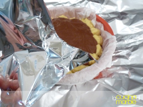 infornare a 180° per 40' con il "cartoccio" chiuso, aprirlo e cuocere per altri 5' in modo che colorisca la parte di torta senza nutella