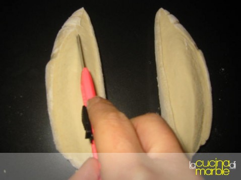 dividere nel senso della lunghezza ogni cilindro in due parti con l'aiuto o di un coltello di legno o di una raspa di plastica