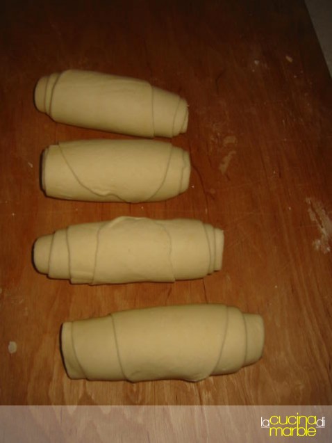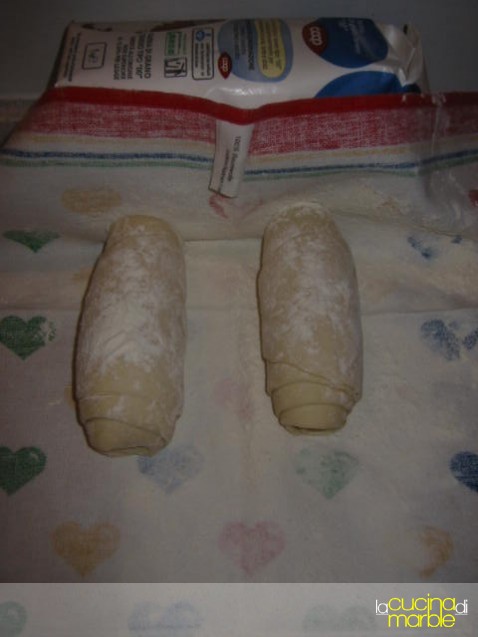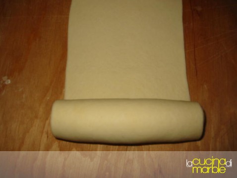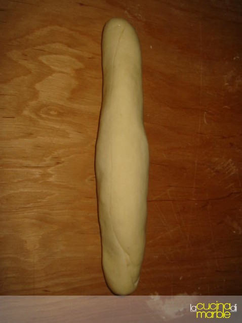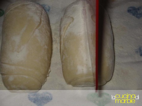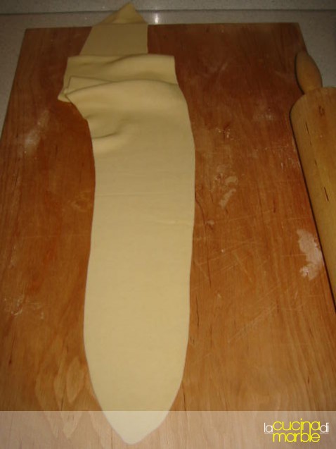 oppure, a breve inserisco le foto, prendere una pallina di impasto, tirarla in un lungo rettangolo, arrotolarlo delicatamente su se stesso dal lato più lungo, appiattirlo delicatamente poggiando il mattarello per il lungo e poi procedere con l'allungamento della striscia