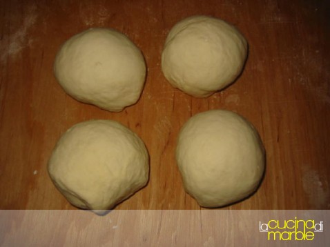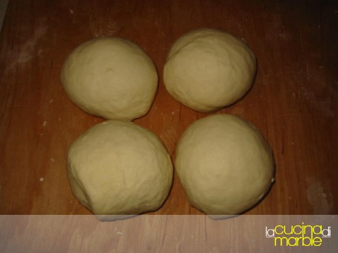 dividere l'impasto in 4 pezzi, e farlo riposare coperto a campana per 25' (si può dividere anche successivamente al riposo)