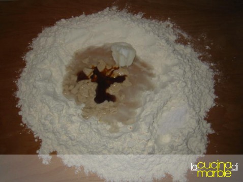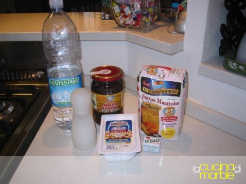 disporre la farina a fontana e al centro mettere il lievito, il malto, lo strutto, parte dell'acqua, il sale in una buchina fatta nella corona di farina (loro la chiamano la casina del sale) -andrà aggiunto solo dopo aver stemperato gli ingredienti ed aver sciolto il lievito totalmente-