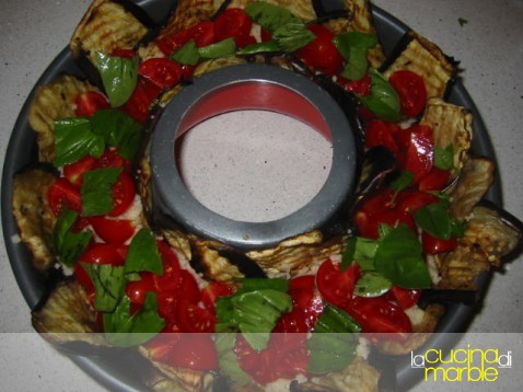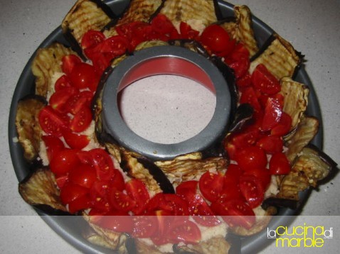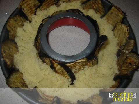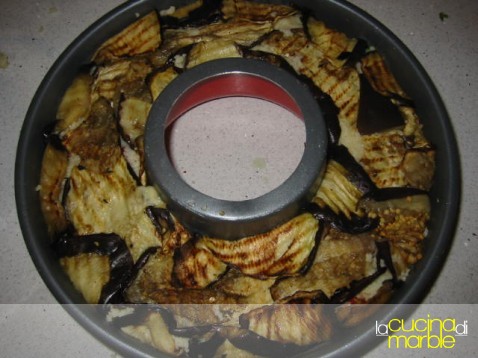 andare a preparare la nostra corona rivestire completamente uno stampo a forma di ciambella con le fette di melanzane lasciandole fuoriuscire dal bordo (serviranno poi per richiudere il tutto)