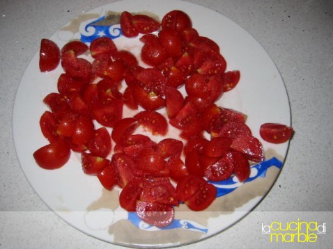 tagliare e salare i pomodorini in modo da fargli perdere un po' di liquido