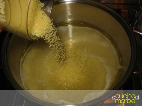 preparare il cous cous come da indicazioni della confezione, generalmente mettendolo in acqua bollente con sale ed olio