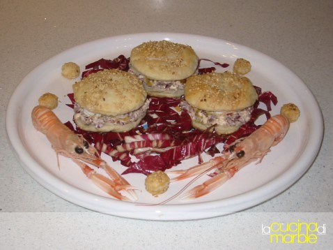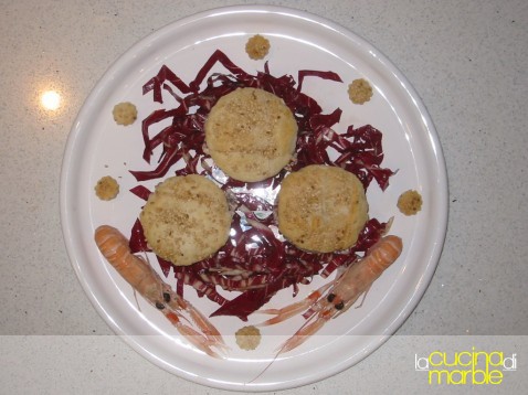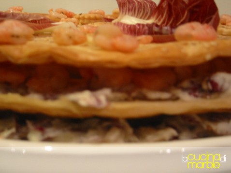 andare a comporre il millefoglie mettendo un primo strato di sfoglia, poi sopra il composto di stracchino e radicchio e sopra i gamberetti
