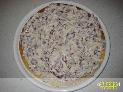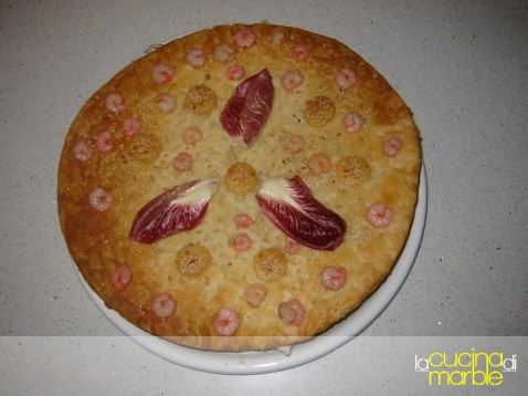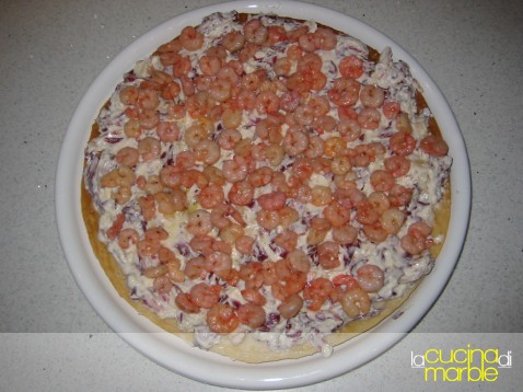 sovrapporre un altro strato di sfoglia, un altro di stracchino e radicchio, un altro di gamberetti, finire con un disco di sfoglia