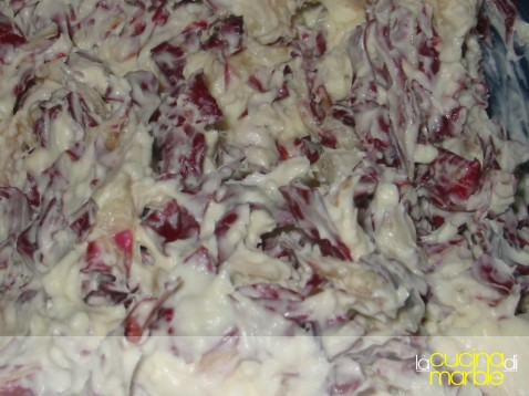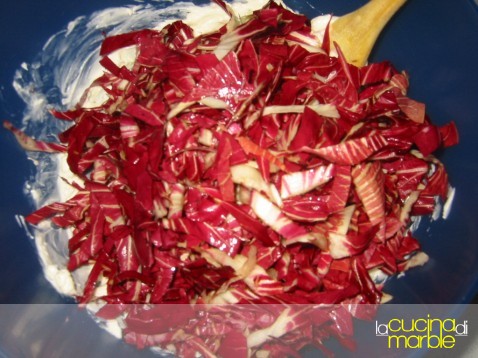 lavorare lo stracchino in modo da ammorbidirlo, aggiungerci il radicchio tagliato a striscioline
