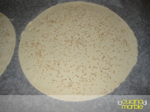 mettere le sfoglie su fogli di cartaforno, bucherellare con i rebbi di una forchetta e cospargere di semi di sesami
