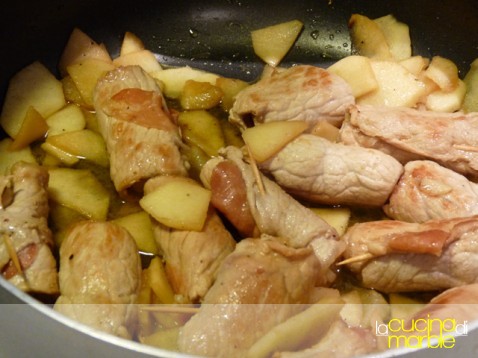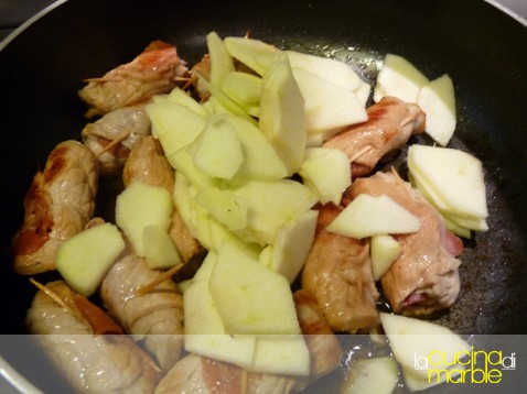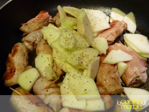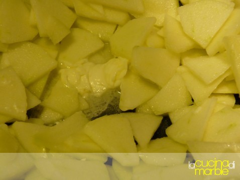 aggiungere altre mele a fettine, amalgamare il tutto e aggiustare di sale e pepe, portare a cottura (non più di altri 5 minuti, le mele devono restare compatte)