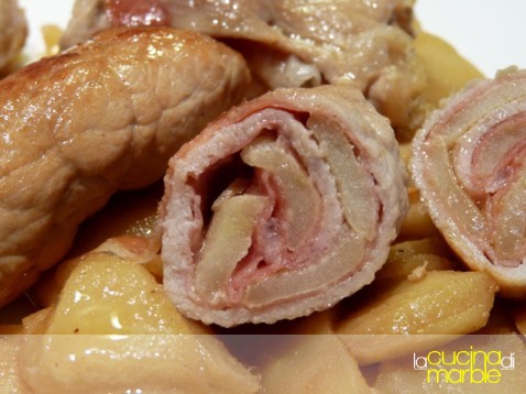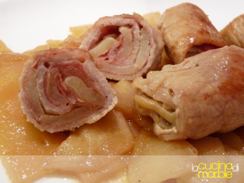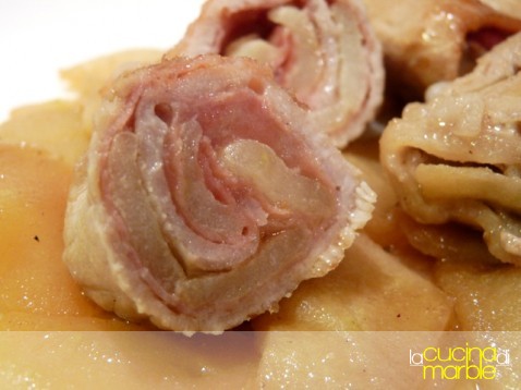ed ecco i nostri involtini pronti, buonissimi!!!!! sull'abbinamento maiale-mele non c'è molto d dire, è un classico ottimo e, con l'aggiunta dello speck e della senape... raggiungiamo il massimo!!!!