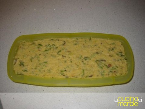 una volta amalgamato bene il tutto (fosse troppo morbido aggiungere un cucchiaio di farina) versare in uno stampo - se si usa il silicone non c'è bisogno, altrimenti ungerlo e spolverizzarlo di pangrattato