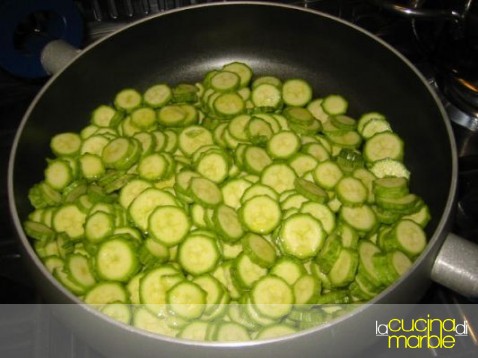 tagliare le zucchine a fettine e farle rosolare in olio, aggiustare di sale