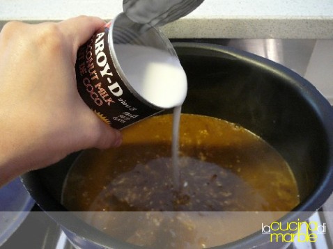 aggiungere il latte di cocco e infine i pezzetti di carne.