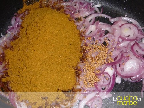 appena sarà appassita ed inizierà a rosolare aggiungere i semi di senape ed il curry, girare per 1-2 minuti.