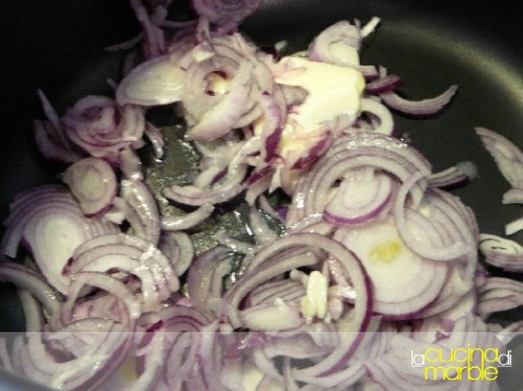 scaldare la cipolla con il burro in un tegame capiente (dopo ci andranno versati il brodo filtrato e la carne)