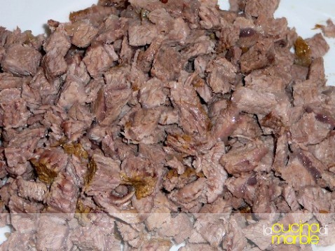 levare la carne dal brodo (eliminare gli ossi, a questo punto non ci serviranno più) e tagliarla a dadini piccolissimi