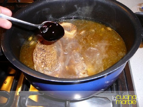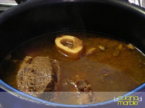 abbassare poi la fiamma e cuocere a fuoco medio-basso per un'ora e mezza-due, quando la carne sarà diventata tenera e il liquido ridotto