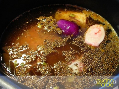filtrare il brodo (magari con l'aiuto di un pannocarta poggiato sul colino, in modo da "pulirlo" il più possibile)