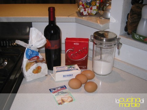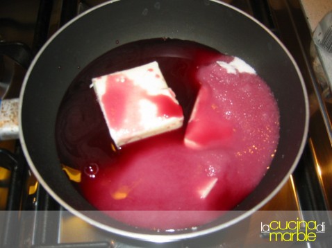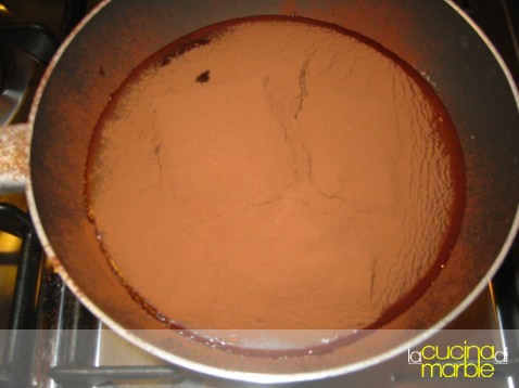 in una casseruola mettere il vino, lo zucchero, il burro ed il cacao setacciato