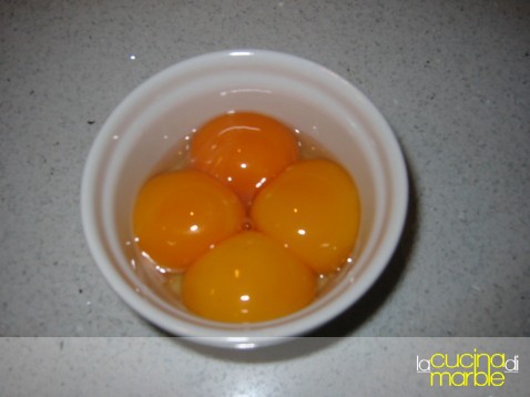 togliere dal fuoco e aggiungere delicatamente, quando il composto sarà raffreddato (per accelerare il raffreddamento cambiare il contenitore), i 4 tuorli