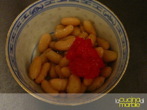 ingredienti: fagioli cannellini già cotti uova di lompo rosse olio pane tostare leggermente le fette di pane, unire i fagioli al caviale, condire con olio e disporre sulle fette di pane. sopra un altro giro d'olio