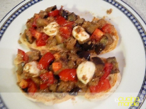 fuori dal fuoco aggiungere le mozzarelline, mettere il composto su fette di pane leggermente tostato e passare in forno un attimo in modo da far fondere leggermente le mozzarelline
