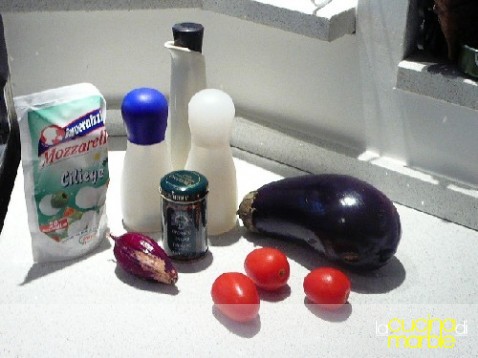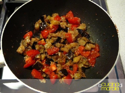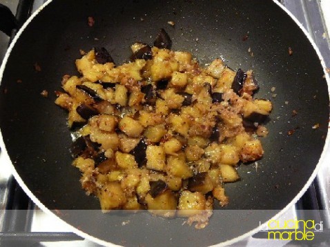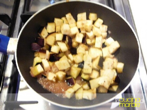 rosolare in olio la cipollina tritata, aggiungere la melanzana a cubetti