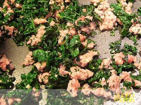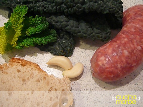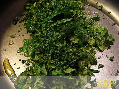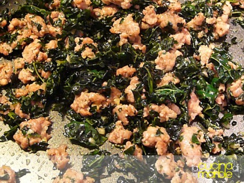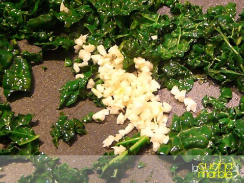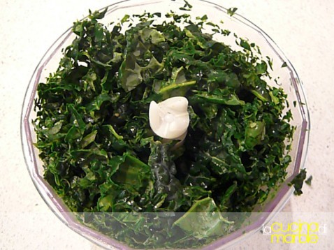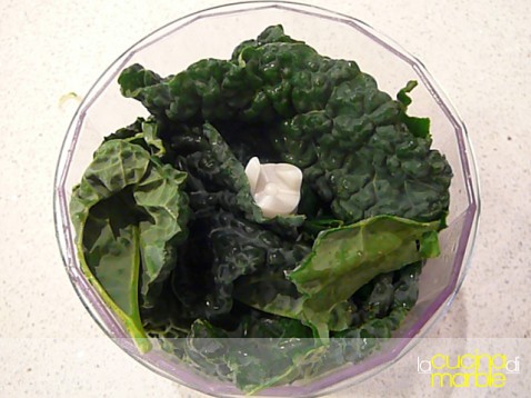 tritare grossolanamente le fette di cavolo nero alle quali avremo levato le parti di costole più dure
