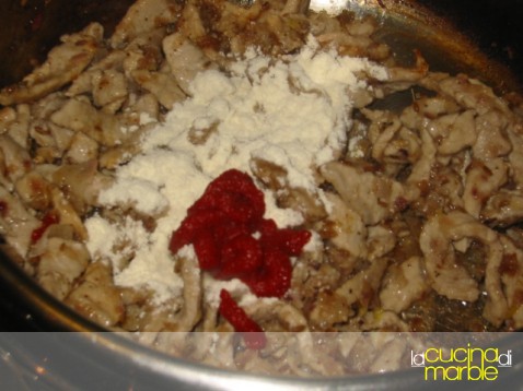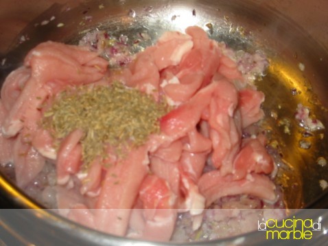 aggiungere il maiale tagliato a listarelle, i semi di cumino e il pepe