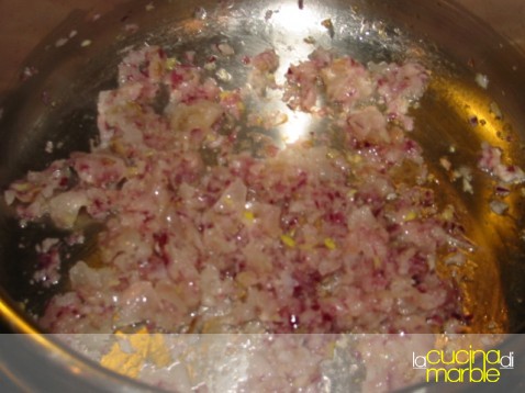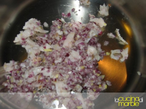 tritare la cipolla finemente con l'aglio e farla rosolare con il lardo tritato