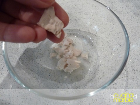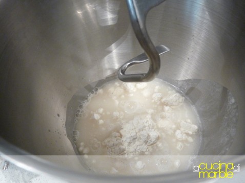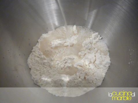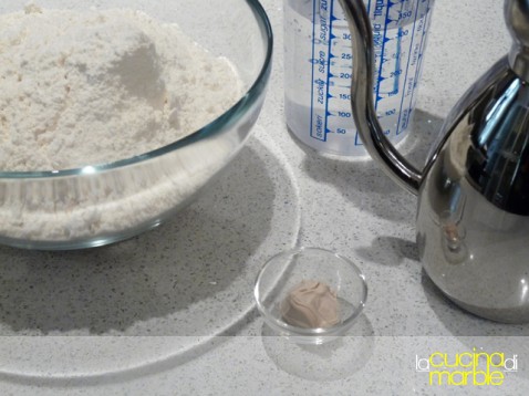 come prima cosa si sciolgono i 5 gr di lievito di birra in 30 gr di acqua e si aggiungono all'impasto