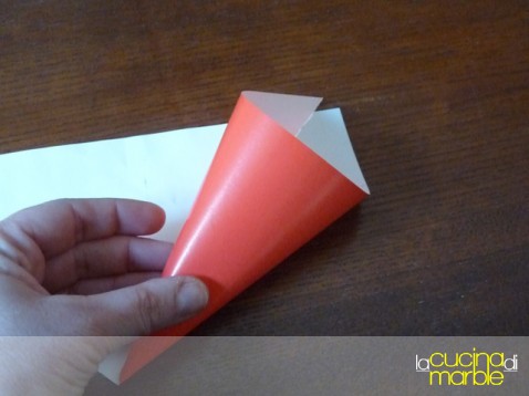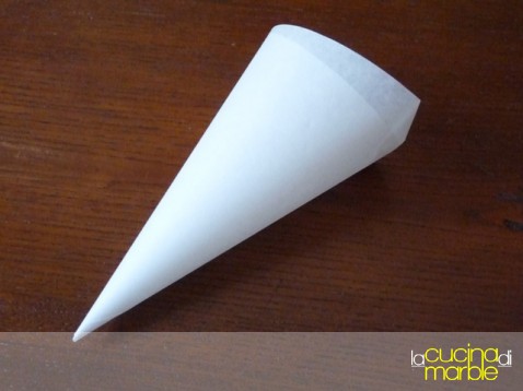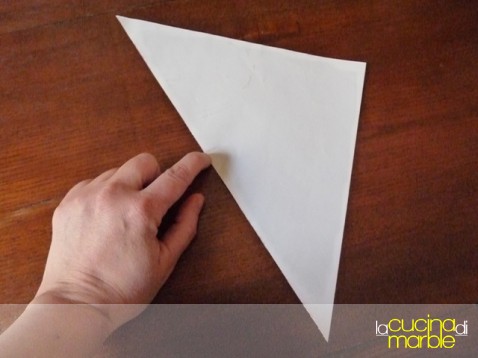 generalmente, quando si fanno i cornetti (che poi non sono altro che contenitori!) per la cioccolata, si tende ad usare un pezzo di cartaforno rettangolare/quadrato, ma usando un foglio triangolare si ottiene un risultato molto più... resistente e contenitivo!!!