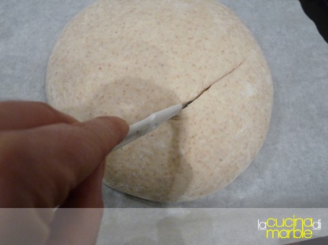 una volta lievitato ho inciso la superficie facendo tre tagli ed ho infornato a 220° per 30 minuti, poi ho spento e l'ho tenuto in forno ancora 5 minuti