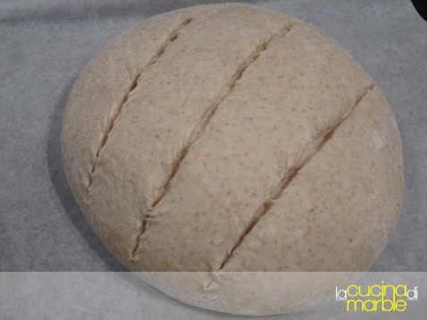 volendo si può lasciare lievitare altre due ore e poi dare forma al pane, questa volta io ho dato subito forma, l'ho infarinato leggermente, ed ho lasciato lievitare coperto a campana per un'ora circa, mi sembrava già ben cresciuto e non ho voluto rischiare che la lievitazione tornasse indietro... ho poca esperienza con le farine integrali!!!!