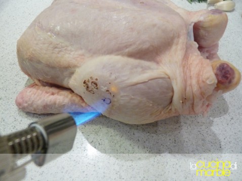 come prima cosa bruciare le penne eventualmente rimaste sul pollo, io l'ho fatto con il flambatore, altrimenti farle bruciacchiare sul fornello acceso