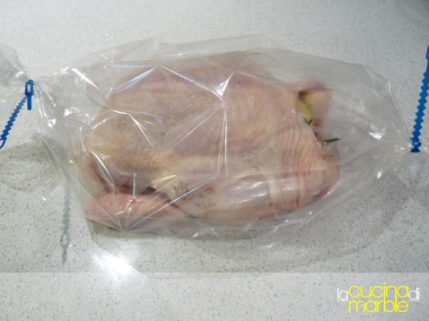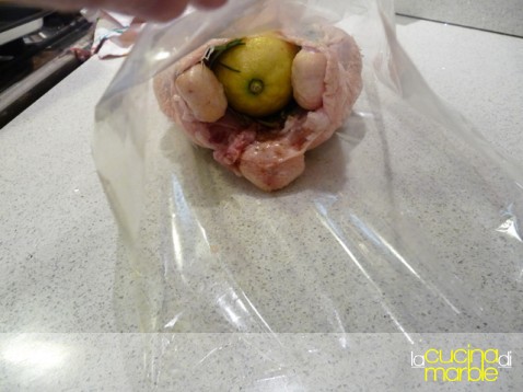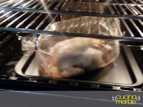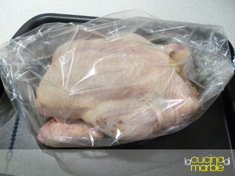 inserire il pollo nella nostra bustona e chiudere le estremità o con i laccetti di corredo o con dello spago da cucina