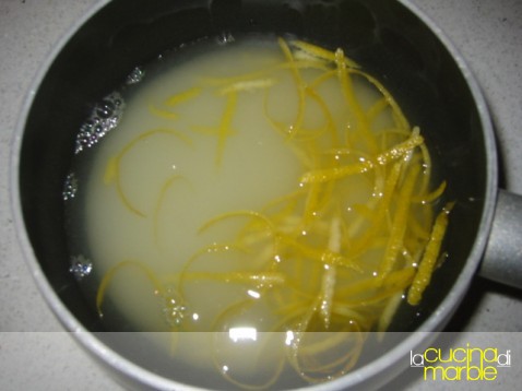 preparare lo sciroppo di copertura mettendo i 150 gr di zucchero rimasto con il succo dell'altro limone, altrettanta acqua e la scorza tagliata a lamelle
