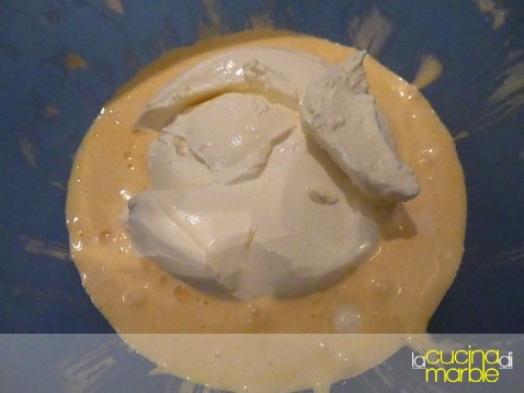 andiamo ad aggiungere poco a poco e delicatamente, con i soliti movimenti dal basso in alto, le chiare precedentemente montate a neve