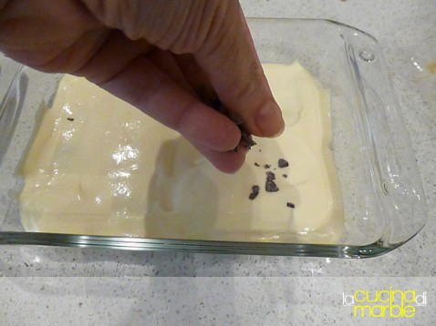 sopra altra crema, altro biscotto inzuppato, altra granella di cioccolato