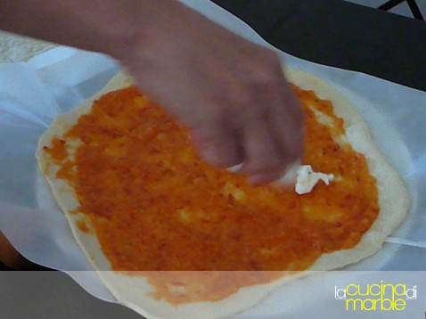 ecco poi Antonella che passa a stendere l'impasto e a farcire le pizze: