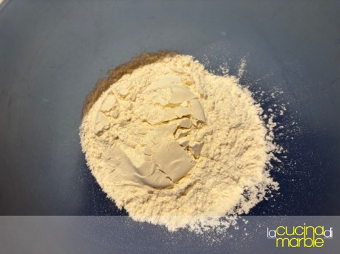 ho riunito in una ciotola prima gli ingredienti secchi: farina, zucchero, lievito