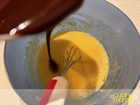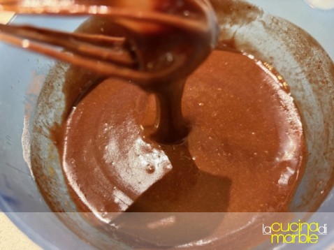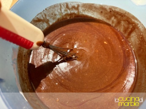 a questo punto aggiungere a filo la cioccolata fusa con il burro continuando a mescolare fino a che non si sarà ottenuto un bel composto omogeneo