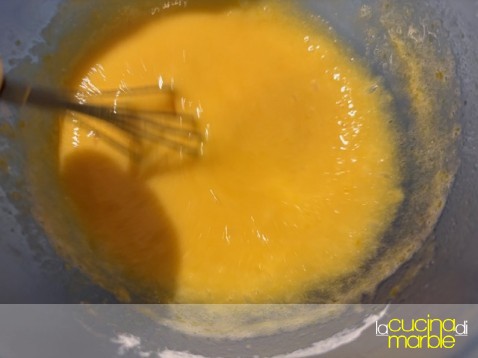 aggiungere alle uova lo zucchero, mescolare bene, magari con l'aiuto di una piccola frusta. considerate che il composto non dovrà montare, la frusta però aiuta ad amalgamare meglio il tutto