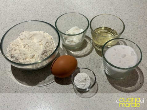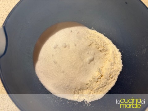 come prima cosa ho riunito gli ingredienti secchi: farina, zucchero, lievito e pizzico di sale